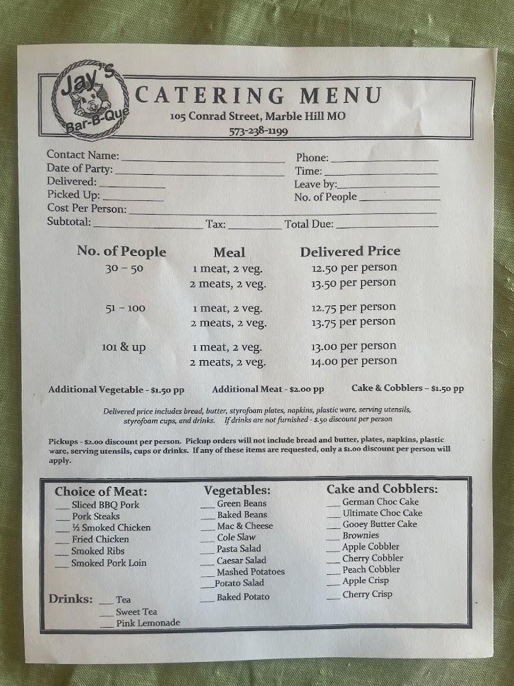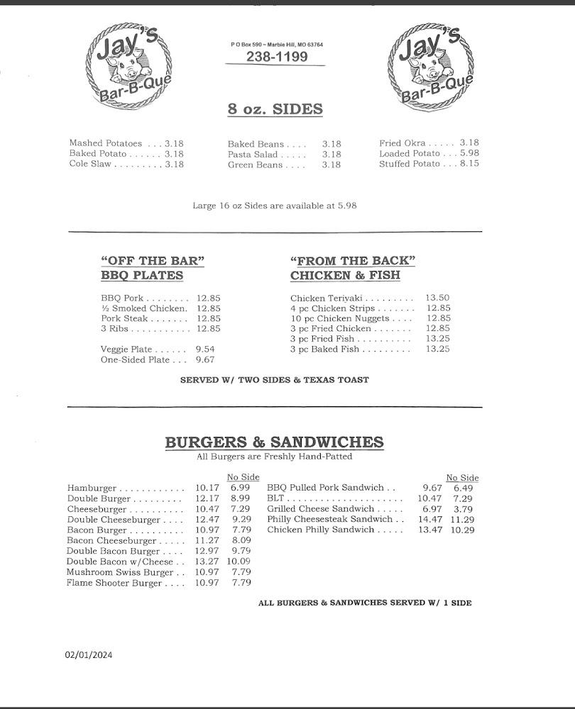 Welcome to Jay's Bar-B-Que, your ultimate destination for mouthwatering grilled dishes in Marble Hill, MO. Nestled at 105 Conrad Ave, our restaurant offers a relaxed atmosphere perfect for families and groups. Enjoy a delectable range of local specialties, from hearty lunches to satisfying dinners, all within a budget-friendly price range of $10 to $20. With convenient amenities like drive-thru service, takeout, and delivery, dining with us is easy and enjoyable. Our menu features excellent desserts, kid-friendly options, and sharing plates. Come experience the welcoming vibe and savor every bite at Jay's Bar-B-Que!